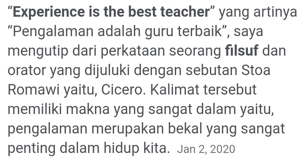 Contextual translation of experience is the best teacher into Latin. Experience is the teacher of all things Tacitus. Berikut kata-kata mutiara bahasa Inggris pilihan tentang pengalaman experience beserta artinya yang kiranya dapat menginspirasi kita dalam kehidupan.